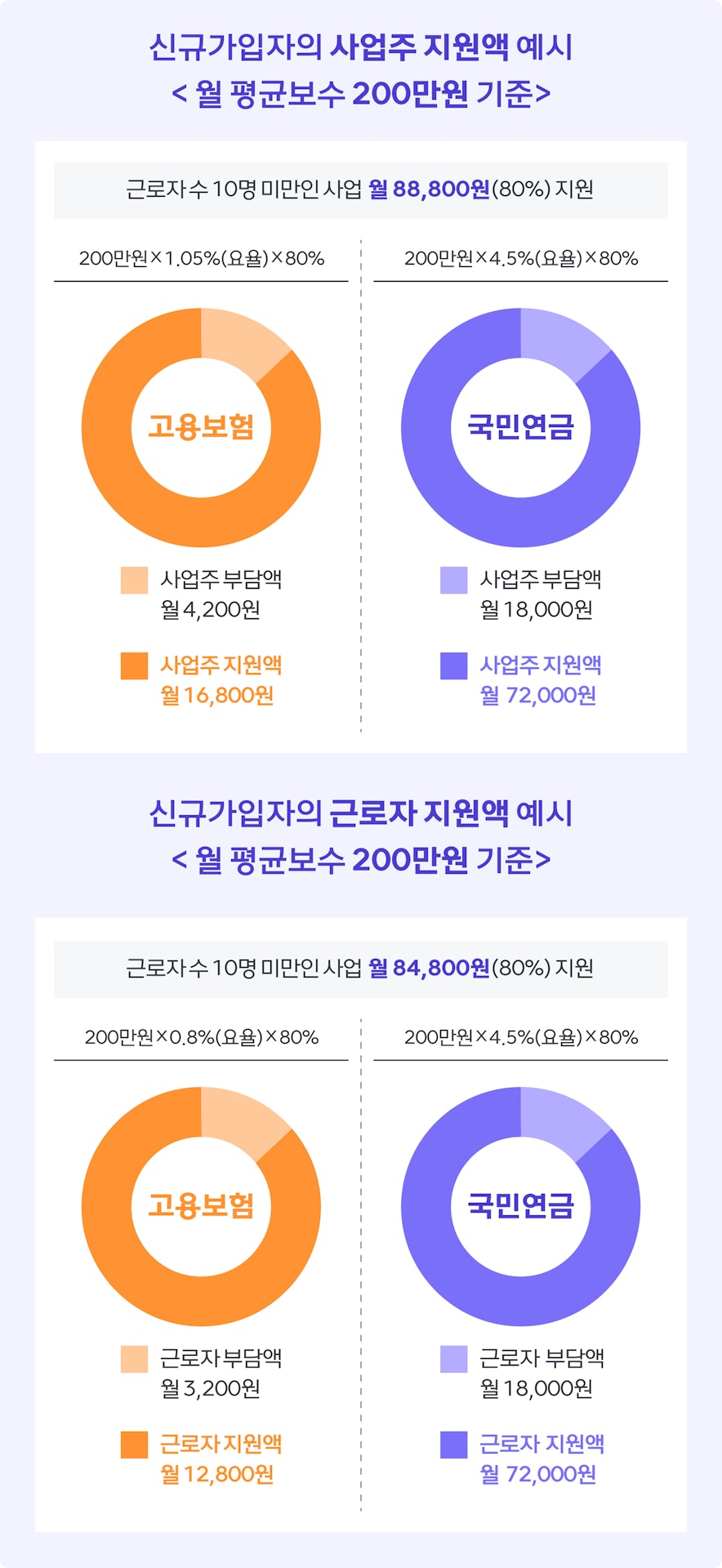 (지원수준) 신규가입 근로자 및 사업주가 부담하는 고용보험과 국민연금 보험료의 80%