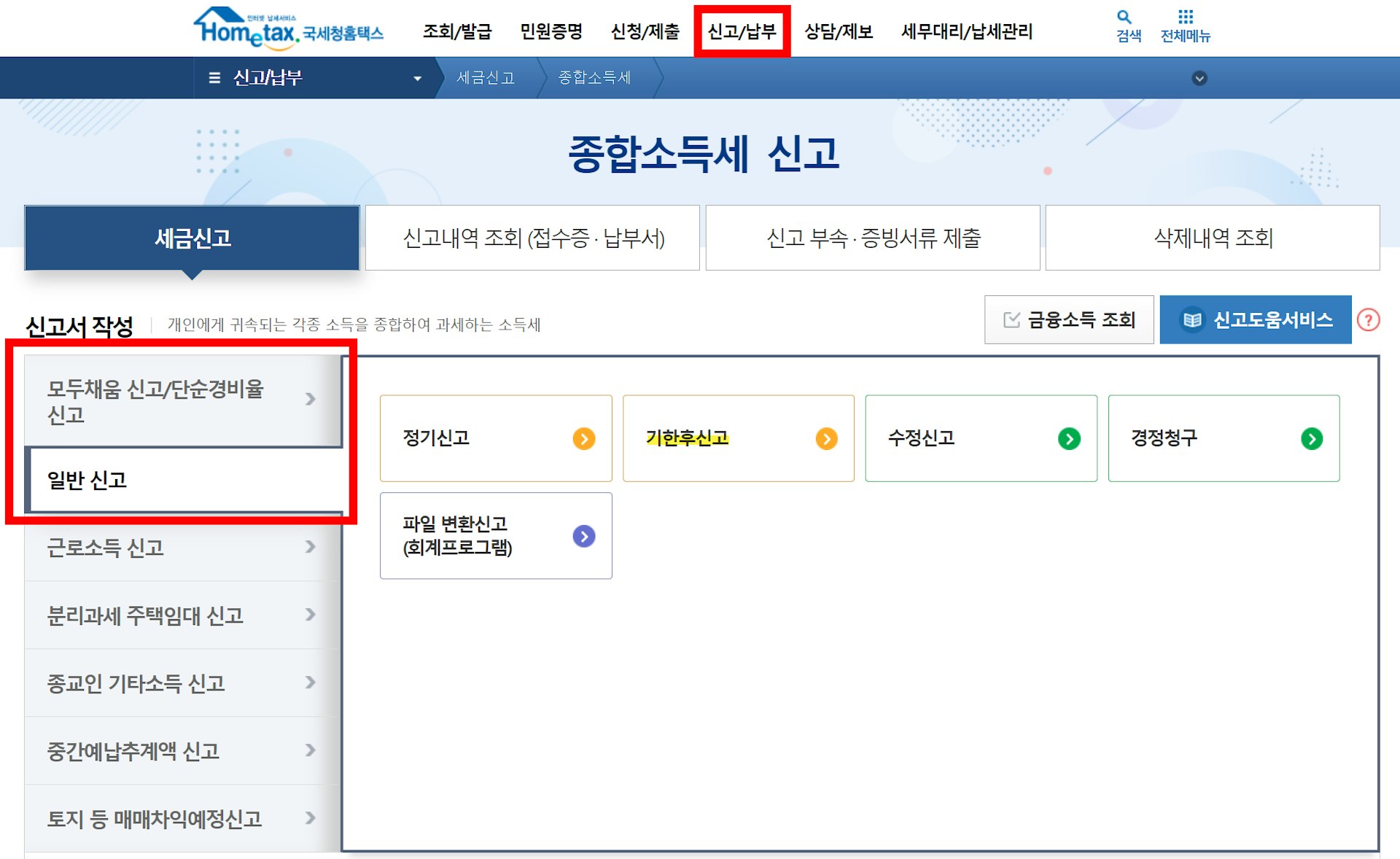 내 신고 유형에 따라 모두채움신고/단순경비율 신고 또는 일반 신고 탭에서 '기한후신고' 진행